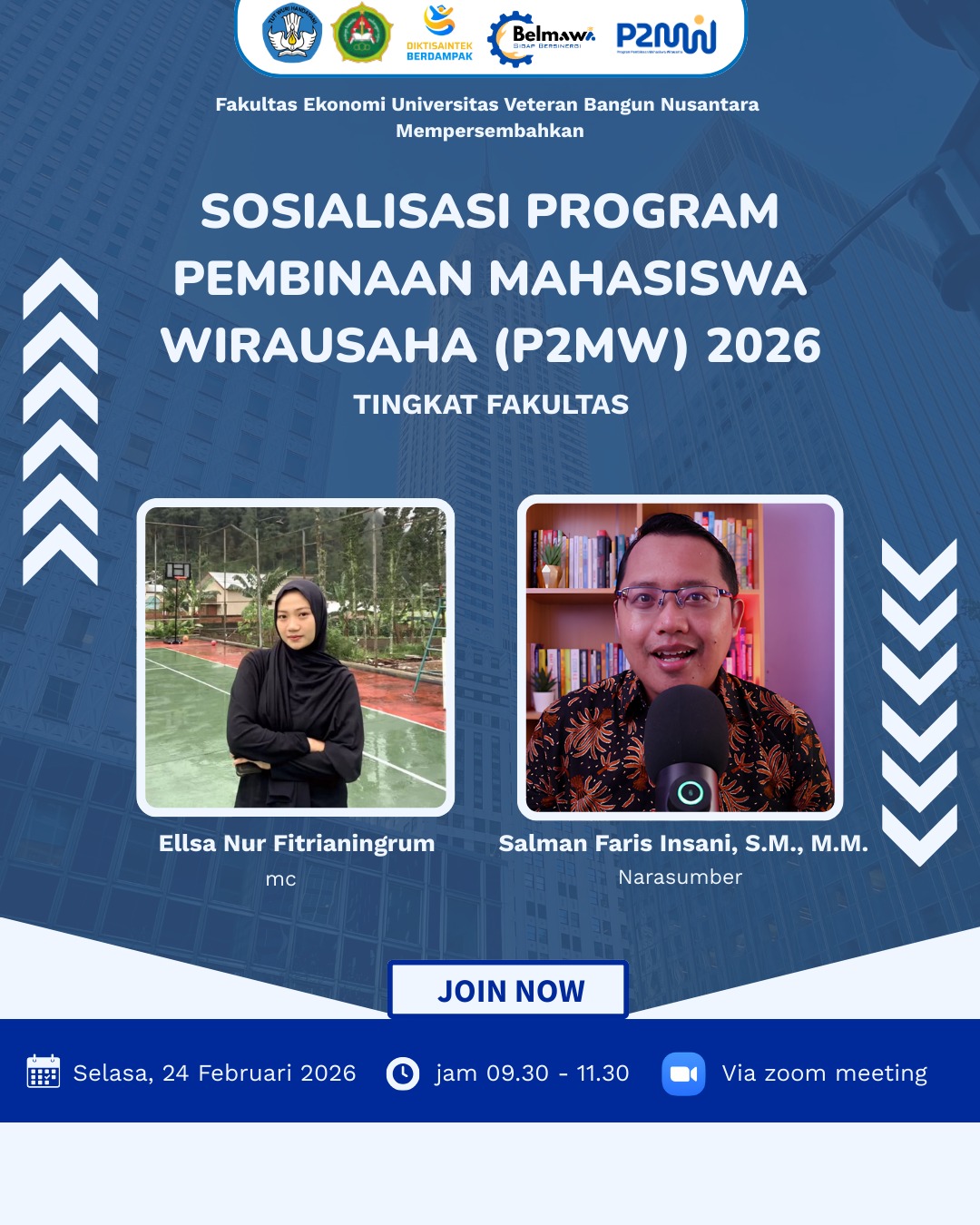 Sukoharjo, (24/2/2026) – Fakultas Ekonomi Universitas Veteran Bangun Nusantara Sukoharjo menyelenggarakan Sosialisasi Program Pembinaan Mahasiswa Wirausaha (P2MW) 2026 Tingkat Fakultas secara daring pada Selasa, 24 Februari 2026. Kegiatan ini diikuti oleh mahasiswa Fakultas Ekonomi dari Program Studi Manajemen dan Akuntansi sebagai bagian dari upaya sistematis fakultas dalam mendorong pengembangan potensi kewirausahaan mahasiswa.Kegiatan diawali dengan sambutan dari Dekan Fakultas Ekonomi UNIVET, Ibu Gustita Arnawati Putri, S.E., M.Sc. Dalam sambutannya, beliau menyampaikan bahwa sosialisasi P2MW 2026 merupakan wujud nyata dukungan Fakultas Ekonomi dalam menciptakan ruang belajar yang relevan dengan kebutuhan mahasiswa saat ini. Fakultas berkomitmen untuk memfasilitasi mahasiswa, baik dari Program Studi Manajemen maupun Akuntansi, agar mampu mengembangkan potensi diri tidak hanya secara akademik, tetapi juga melalui aktivitas kewirausahaan yang aplikatif dan berorientasi pada masa depan.Lebih lanjut disampaikan bahwa program seperti P2MW menjadi sarana strategis bagi mahasiswa untuk mengintegrasikan pengetahuan yang diperoleh di bangku kuliah dengan praktik nyata di lapangan. Melalui kegiatan ini, fakultas berharap mahasiswa semakin percaya diri untuk berinovasi, membangun usaha, serta berani bersaing di tingkat nasional.Sebagai narasumber utama, Salman Faris Insani, S.E., M.M., dosen Fakultas Ekonomi UNIVET, memaparkan kebijakan dan mekanisme P2MW 2026, sekaligus menghadirkan pembahasan yang bersifat aplikatif melalui kupasan judul-judul usaha yang lolos KMI Expo 2025 dan bedah proposal mahasiswa UNIVET yang berhasil melaju ke tahap KMI Expo 2025. Pendekatan ini memberikan gambaran konkret kepada peserta mengenai standar kualitas proposal yang dinilai di tingkat nasional.Dalam pemaparannya, Salman menekankan bahwa keberhasilan dalam P2MW tidak hanya ditentukan oleh kreativitas ide, tetapi juga oleh kemampuan mahasiswa dalam memahami masalah pasar, merancang solusi yang relevan, serta menyusun proposal yang sistematis dan berbasis data. Melalui studi kasus proposal yang telah lolos, mahasiswa diajak belajar langsung dari praktik terbaik yang telah terbukti berhasil.Kegiatan yang dipandu oleh Ellsa Nur Fitrianingrum selaku Master of Ceremony ini berlangsung interaktif dengan sesi diskusi dan tanya jawab. Antusiasme peserta menunjukkan meningkatnya minat mahasiswa Fakultas Ekonomi UNIVET untuk terlibat aktif dalam program kewirausahaan mahasiswa dan ajang KMI Expo di tingkat nasional.Melalui kegiatan sosialisasi ini, Fakultas Ekonomi UNIVET menegaskan komitmennya dalam mendukung lahirnya wirausaha muda yang inovatif, adaptif, dan berdaya saing. Kegiatan ini diharapkan menjadi langkah awal dalam meningkatkan kualitas proposal mahasiswa pada P2MW 2026 serta memperluas capaian prestasi mahasiswa di tingkat nasional. Penulis : Salman Faris Insani, SE., MM