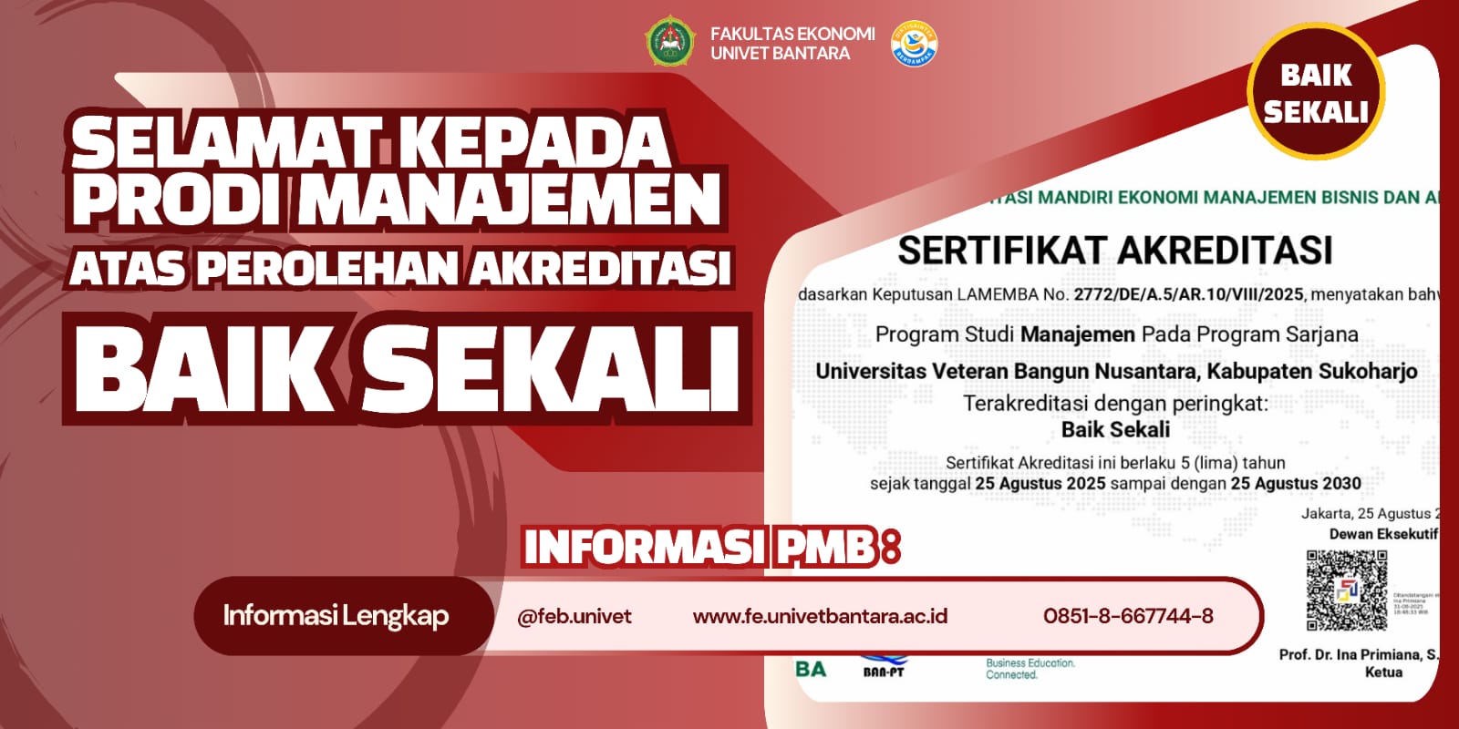 Sukoharjo, [03/09/2025] – Program Studi Manajemen Fakultas Ekonomi Universitas Veteran Bantara Sukoharjo dengan bangga mengumumkan bahwa telah berhasil meraih akreditasi "Baik Sekali" dari Lembaga Akreditasi Mandiri Ekonomi dan Bisnis (LAMEMBA). Ini merupakan pencapaian penting yang menunjukkan kualitas dan komitmen Program Studi Manajemen dalam menyediakan pendidikan berkualitas di bidang ekonomi dan manajemen. Akreditasi "Baik Sekali" ini diperoleh melalui proses evaluasi yang komprehensif dan ketat, yang melibatkan penilaian terhadap aspek kurikulum, pengajaran, fasilitas, dan kontribusi program studi terhadap perkembangan ilmu ekonomi dan bisnis. Keberhasilan ini menjadi bukti nyata atas kerja keras dan dedikasi seluruh sivitas akademika dalam menciptakan lingkungan pendidikan yang mendukung pengembangan kompetensi mahasiswa.